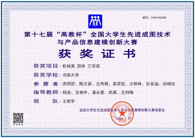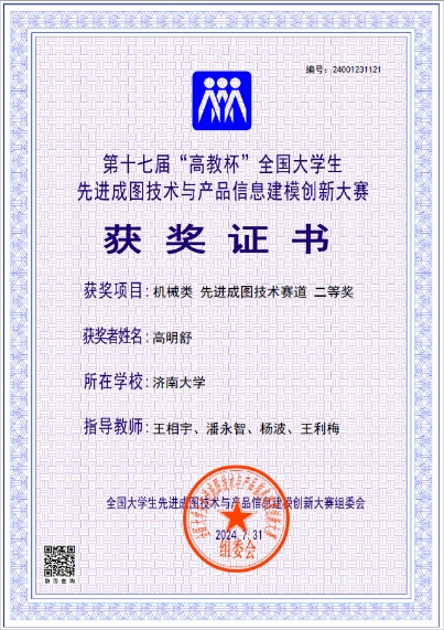 学生高明舒获得先进成图技术赛道国家级二等奖,学生陈文豪、葛荣哲、沙枫林、王传祺分别获得先进成图技术赛道国家级三等奖;学生高明舒、葛荣哲得轻量化设计赛道国家级三等奖;指导教师杨波、王相宇、潘永智、武爽、王利梅分别获得机械类优秀指导教师国家级三等奖。