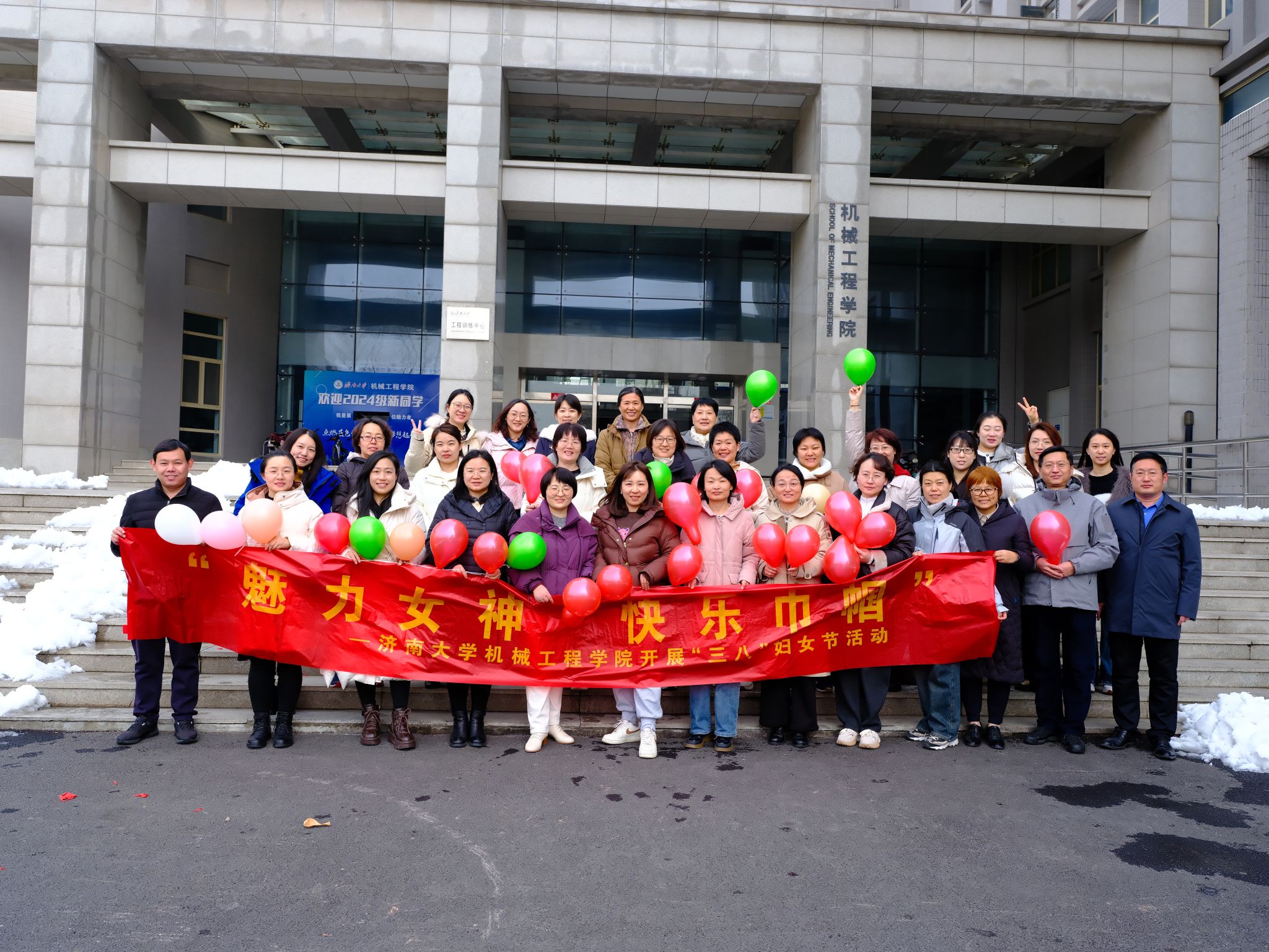 女教工们身手敏捷,毽子在空中划出一道道优美的弧线,让人目不暇接。与此同时,跳绳比赛也在有序地进行着。女教工们轻盈跳跃,动作协调一致,展现出良好的身体素质和团队精神。随后,教工们在机械学院楼前合影留念。